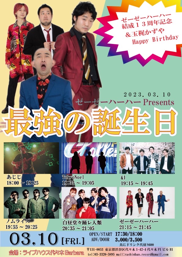 前売り ¥3000/当日 ¥3500(ドリンク代各¥600別)
