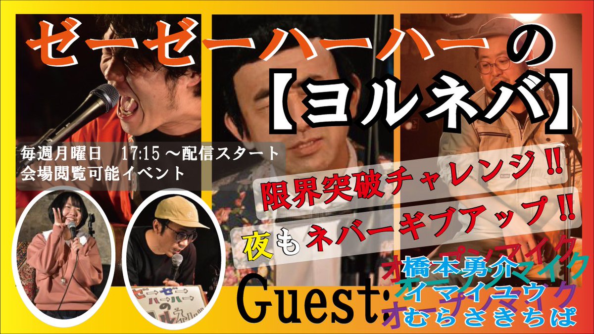 『ヨルネバ』ご視聴ありがとう⤴️🙆本日のゲストはオープンマイクチームでした。本日の珍ワード『ダンゴムシ』『ノルマ』ありがとうございました🌈来週5/24ゲストはTHEだいじょぶズ(@TheDaijobus)ようやくの絡み❗️その前に5/21で対バン!楽しみだー🤟
